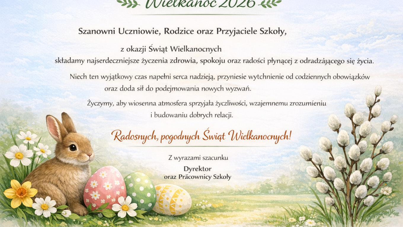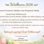 czytaj dalej...Szanowni Uczniowie, Rodzice oraz Przyjaciele Szkoły, z okazji Świąt Wielkanocnychskładamy najserdeczniejsze życzeniazdrowia, spokoju oraz radości płynącejz odradzającego się życia. Niech