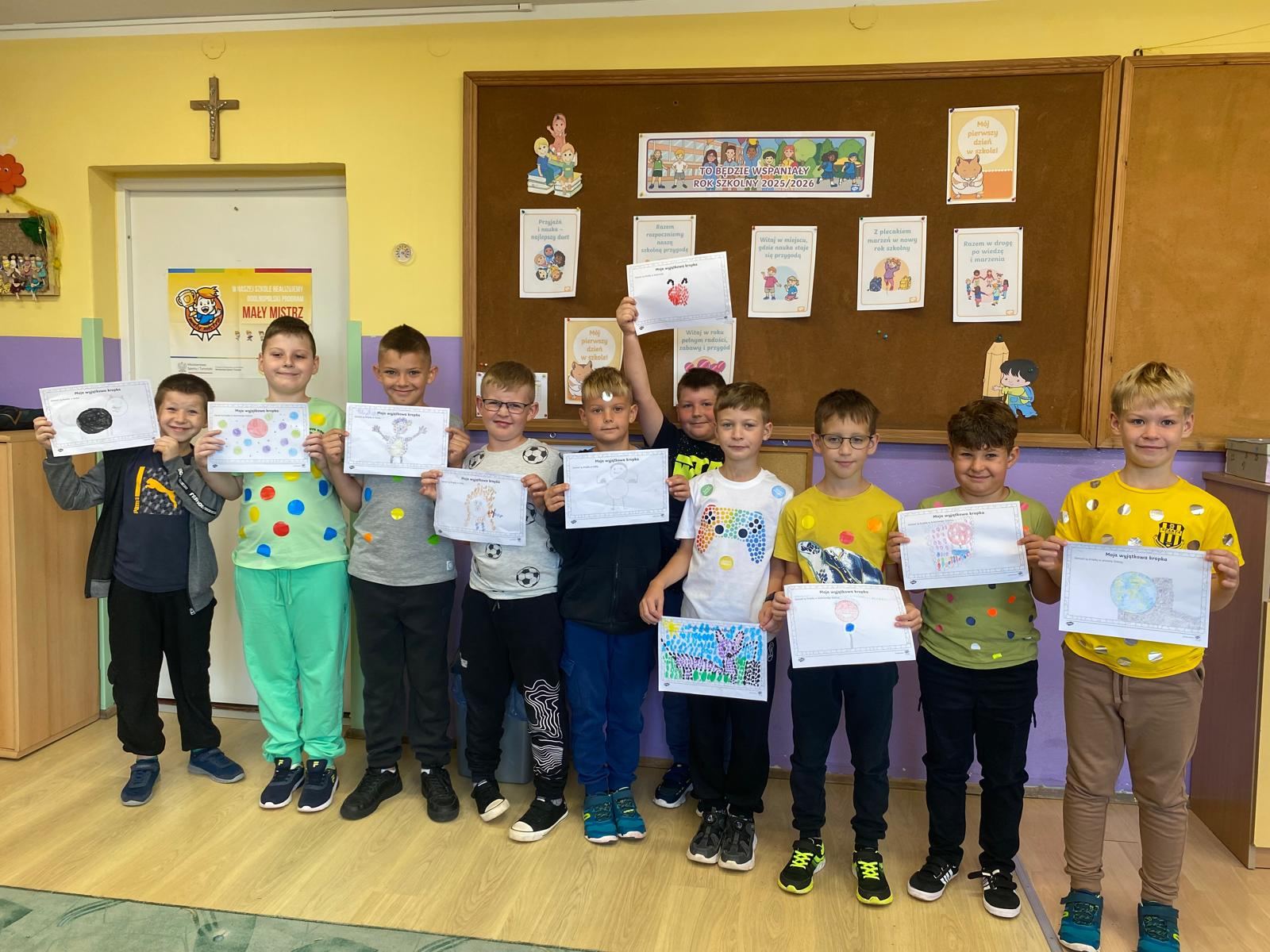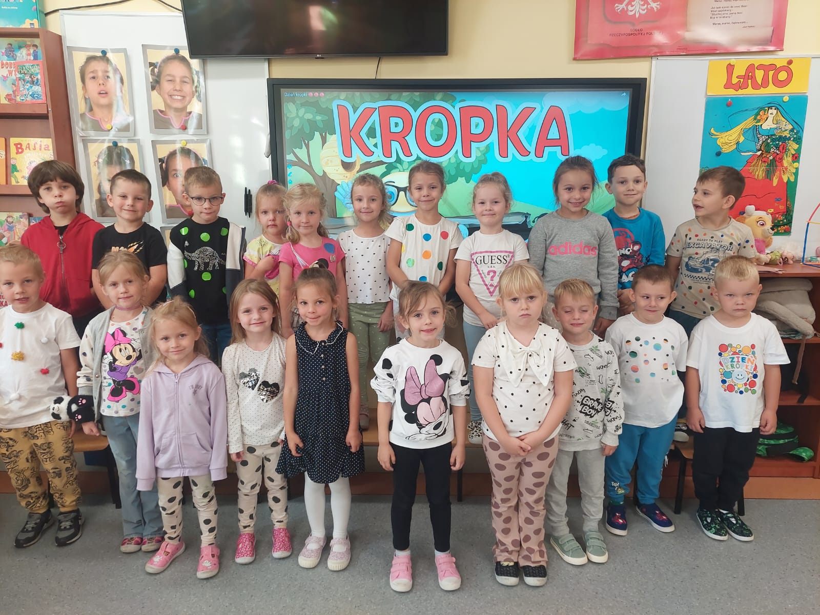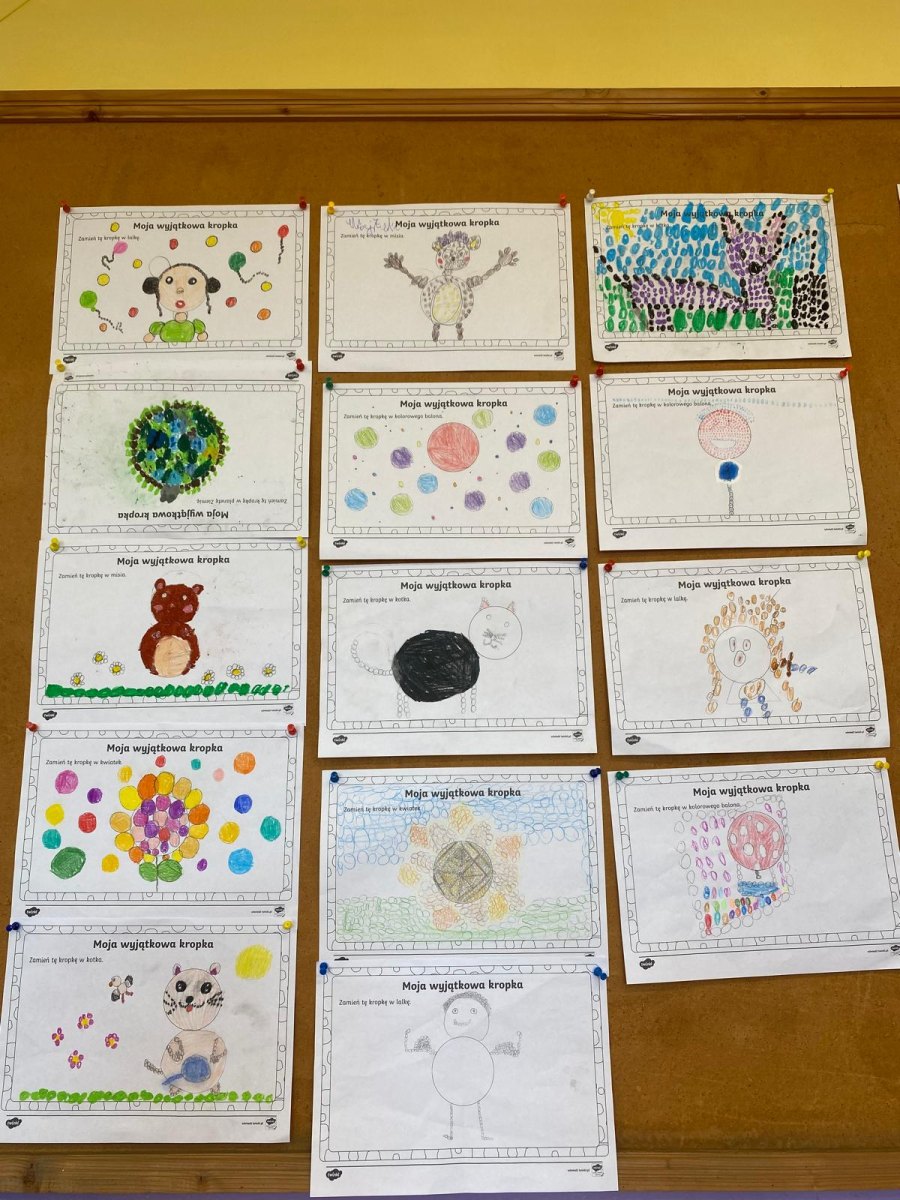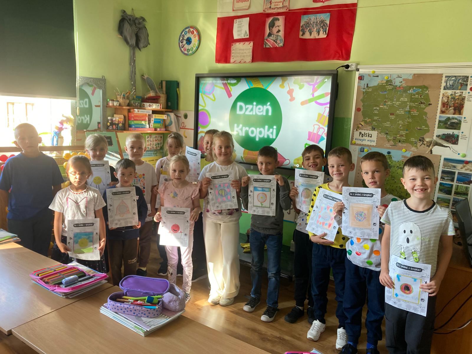 Dnia 15 września najmłodsi w naszej szkole obchodzili Międzynarodowy Dzień Kropki czyli International Dot Day. Święto to, swój początek zawdzięcza książce Petera H. Reynoldsa,pt. „The Dot”, w której poznajemy historię Vashti, dziewczynki, która nie wierzyła w swoje możliwości plastyczne, ale dzięki malutkiej kropce i nauczycielce plastyki uwierzyła w siebie. Dzień Kropki to święto inności, kreatywności i rozwijania ukrytego potencjału, bo przecież każdy ma talent, tylko nie zawsze umiemy go odkryć, potrzebujemy kogoś kto ten talent w nas zauważy. Tego dnia dzieci oglądały prezentacje multimedialne o kropce, rozwiązywały zadania z kropką, wykonywały prace plastyczne, grały w gry planszowe a najważniejsze dobrze się przy tym bawiąc !