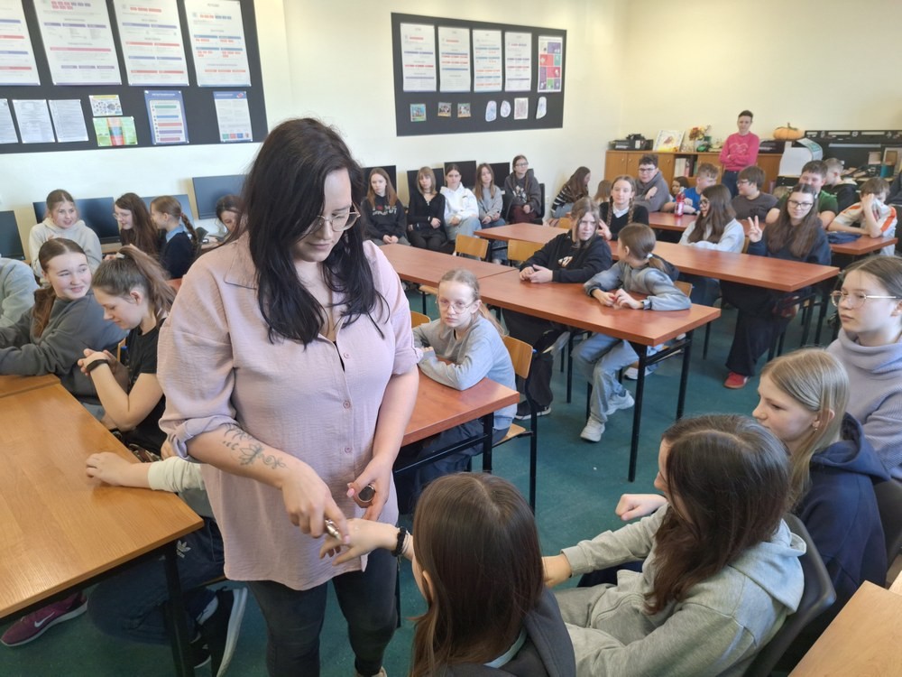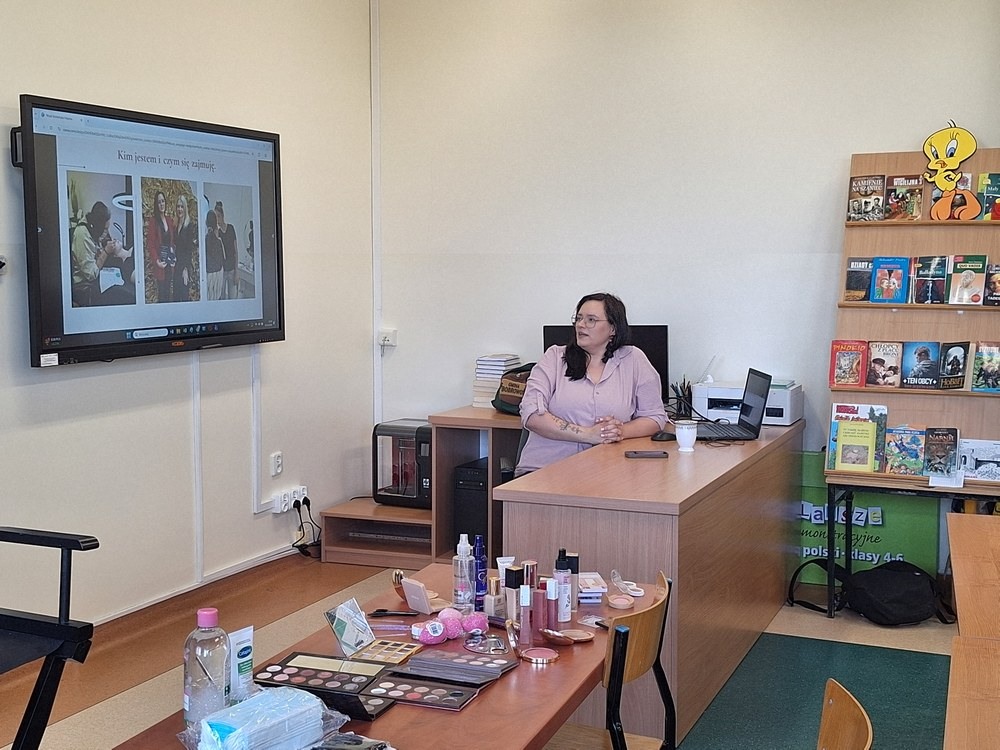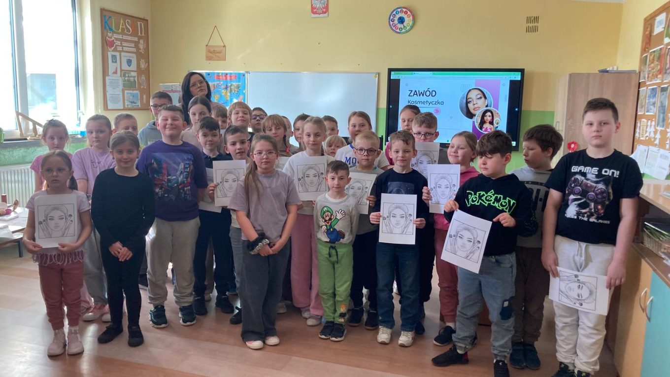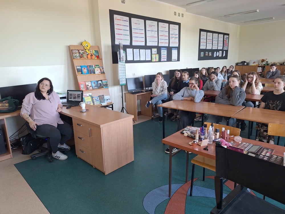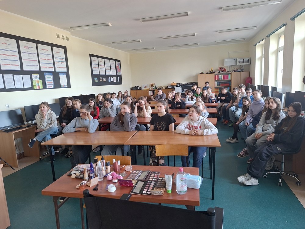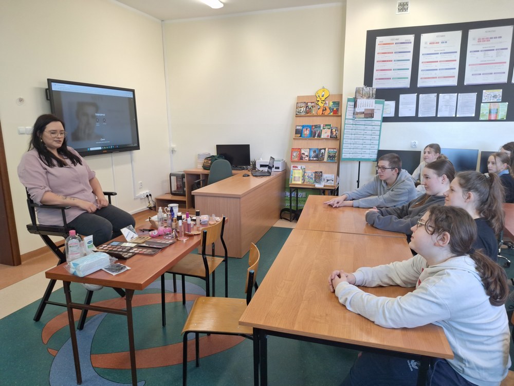 W ramach cyklu „Poznajemy pracę swoich rodziców” naszą szkołę odwiedziła Pani Paulina Śliwińska, mama Filipa. Pani Paulina jest kosmetyczką oraz właścicielką salonu kosmetycznego Paulina Śliwińska Makijażownia & Beauty Studio. Podczas spotkania opowiedziała uczniom o swoim zawodzie, a także o tym, jak wygląda codzienna praca w salonie kosmetycznym. Pani Paulina z dużą pasją mówiła o kosmetologii, która jest nie tylko jej pracą, ale również wielkim zainteresowaniem. Uczniowie mogli dowiedzieć się, jak wygląda droga do tego zawodu, jakie umiejętności są potrzebne oraz jak ważna jest dokładność, cierpliwość i dbałość o szczegóły. Gość przygotowała również prelekcje dla starszych klas, podczas których opowiedziała o makijażu, higienie i czystości. Uczniowie dowiedzieli się, jak ważna jest higiena osobista, w jaki sposób o nią dbać na co dzień oraz jakie nawyki pomagają zachować zdrową i zadbaną skórę. Duże zainteresowanie wzbudziła część praktyczna spotkania. Pani Paulina pokazała, jak wykonać estetyczny i nienaganny makijaż, a chętne uczennice mogły spróbować swoich sił w jego wykonaniu. Dziewczęta z dużym zaangażowaniem uczestniczyły w zajęciach i chętnie wykonywały sobie makijaż pod okiem specjalistki. Spotkanie było bardzo ciekawe i inspirujące. Dzięki wizycie Pani Pauliny uczniowie mogli lepiej poznać zawód kosmetyczki oraz przekonać się, jak ważna jest higiena i dbanie o siebie na co dzień. Serdecznie dziękujemy Pani Paulinie Śliwińskiej za poświęcony czas i podzielenie się swoją wiedzą oraz doświadczeniem.