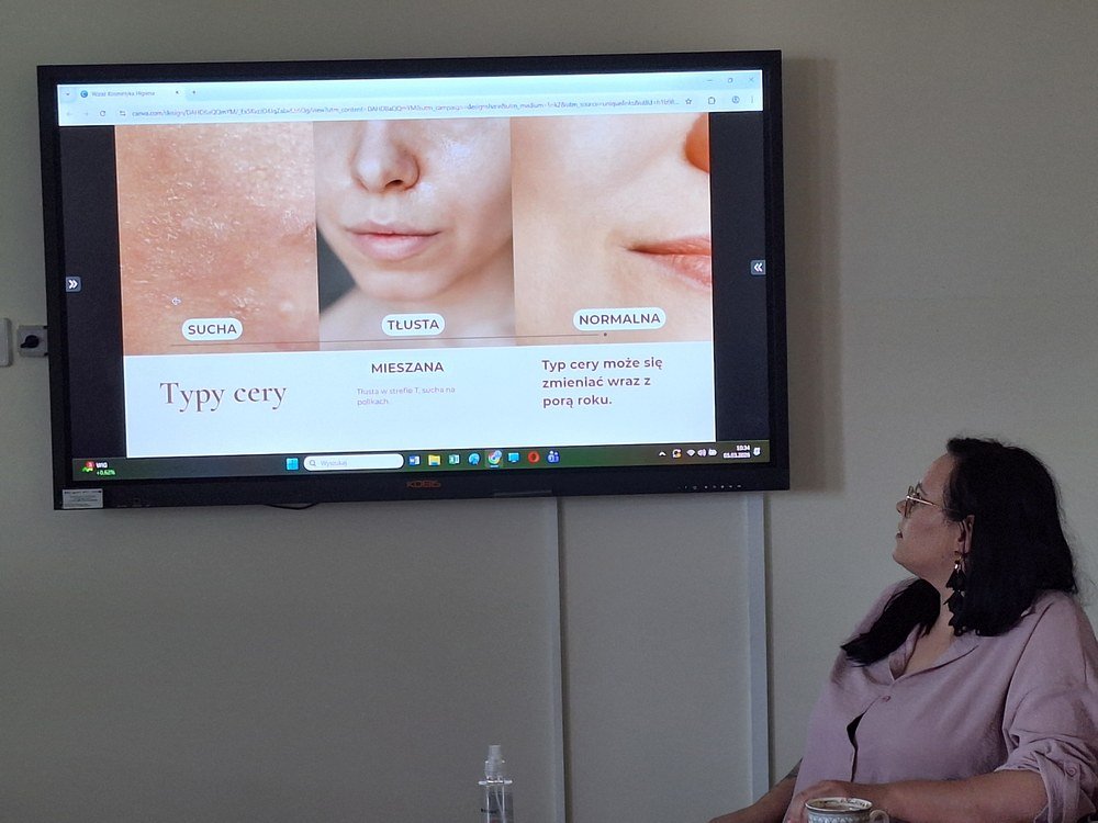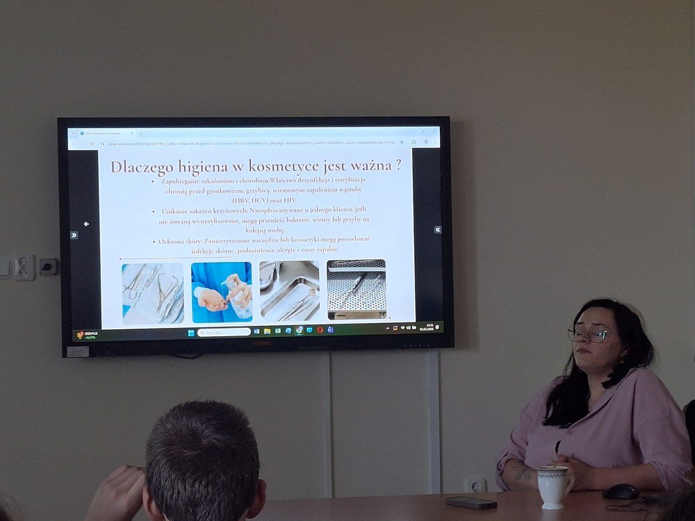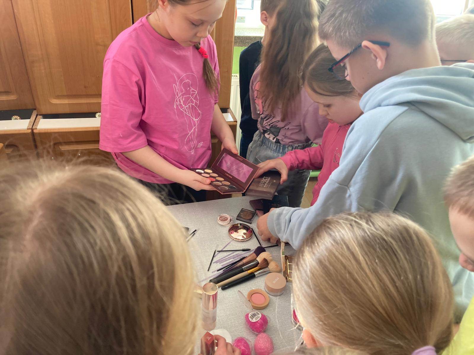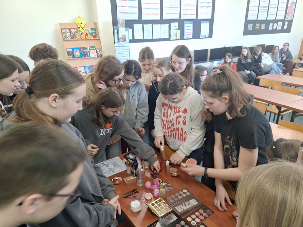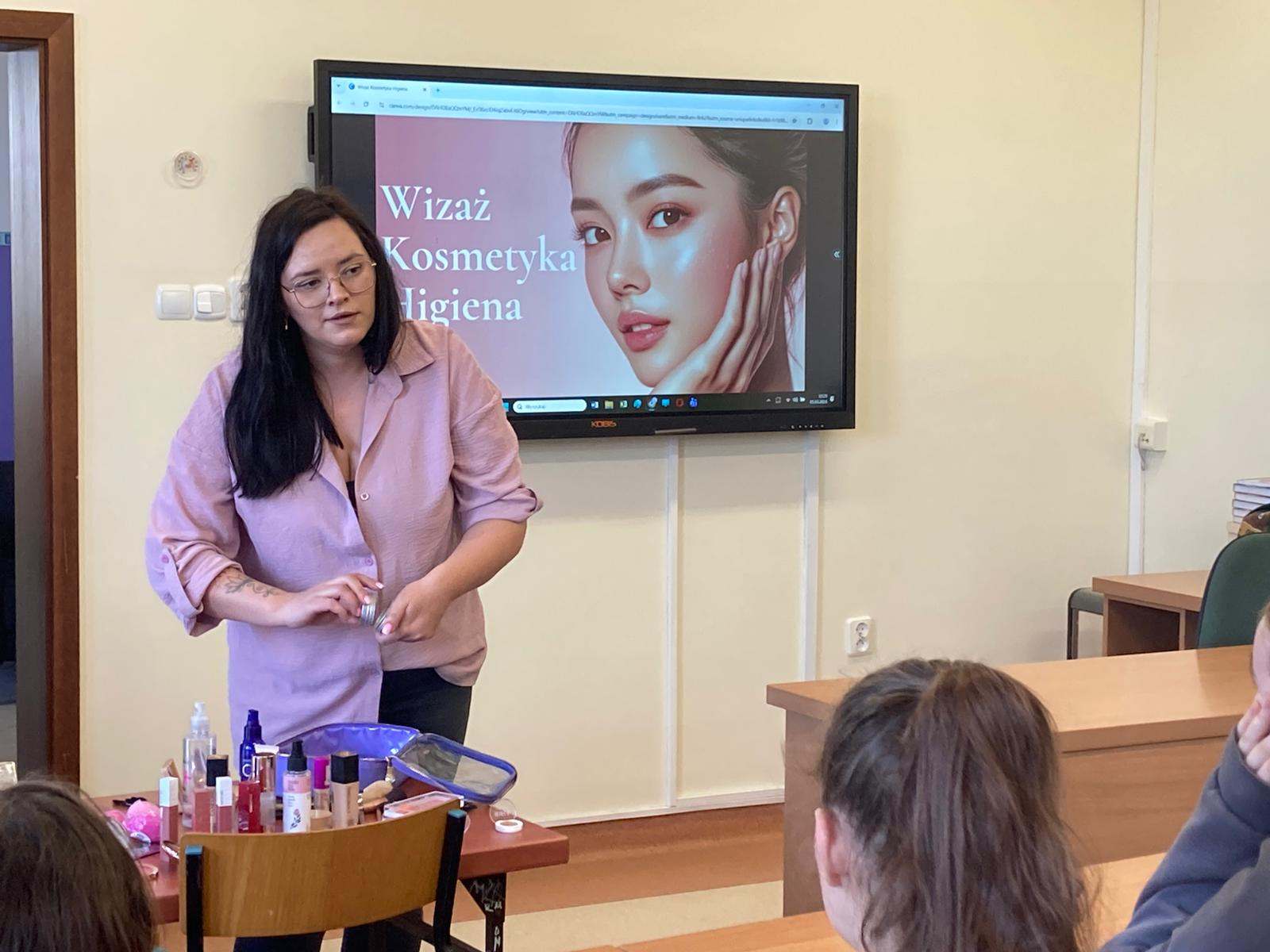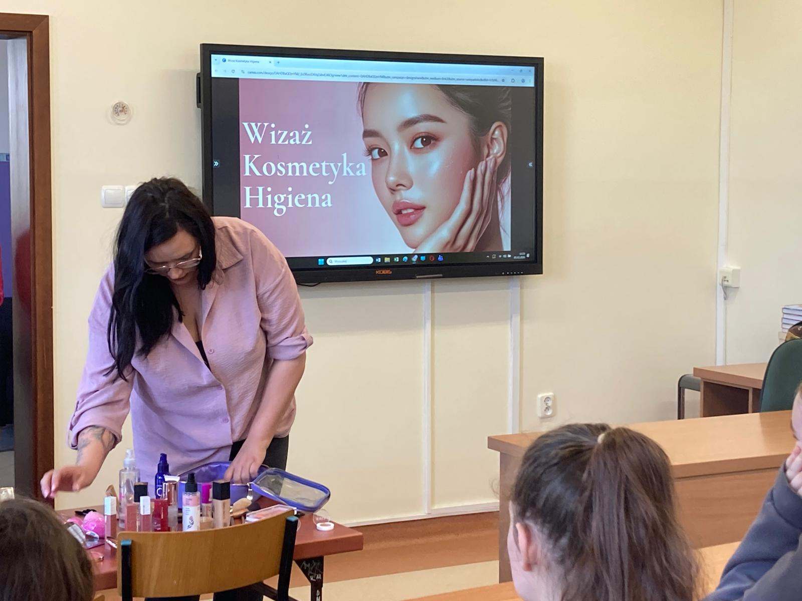 W ramach cyklu „Poznajemy pracę swoich rodziców” naszą szkołę odwiedziła Pani Paulina Śliwińska, mama Filipa. Pani Paulina jest kosmetyczką oraz właścicielką salonu kosmetycznego Paulina Śliwińska Makijażownia & Beauty Studio. Podczas spotkania opowiedziała uczniom o swoim zawodzie, a także o tym, jak wygląda codzienna praca w salonie kosmetycznym. Pani Paulina z dużą pasją mówiła o kosmetologii, która jest nie tylko jej pracą, ale również wielkim zainteresowaniem. Uczniowie mogli dowiedzieć się, jak wygląda droga do tego zawodu, jakie umiejętności są potrzebne oraz jak ważna jest dokładność, cierpliwość i dbałość o szczegóły. Gość przygotowała również prelekcje dla starszych klas, podczas których opowiedziała o makijażu, higienie i czystości. Uczniowie dowiedzieli się, jak ważna jest higiena osobista, w jaki sposób o nią dbać na co dzień oraz jakie nawyki pomagają zachować zdrową i zadbaną skórę. Duże zainteresowanie wzbudziła część praktyczna spotkania. Pani Paulina pokazała, jak wykonać estetyczny i nienaganny makijaż, a chętne uczennice mogły spróbować swoich sił w jego wykonaniu. Dziewczęta z dużym zaangażowaniem uczestniczyły w zajęciach i chętnie wykonywały sobie makijaż pod okiem specjalistki. Spotkanie było bardzo ciekawe i inspirujące. Dzięki wizycie Pani Pauliny uczniowie mogli lepiej poznać zawód kosmetyczki oraz przekonać się, jak ważna jest higiena i dbanie o siebie na co dzień. Serdecznie dziękujemy Pani Paulinie Śliwińskiej za poświęcony czas i podzielenie się swoją wiedzą oraz doświadczeniem.