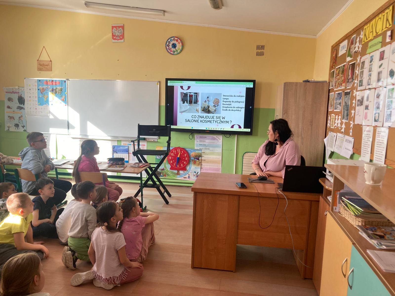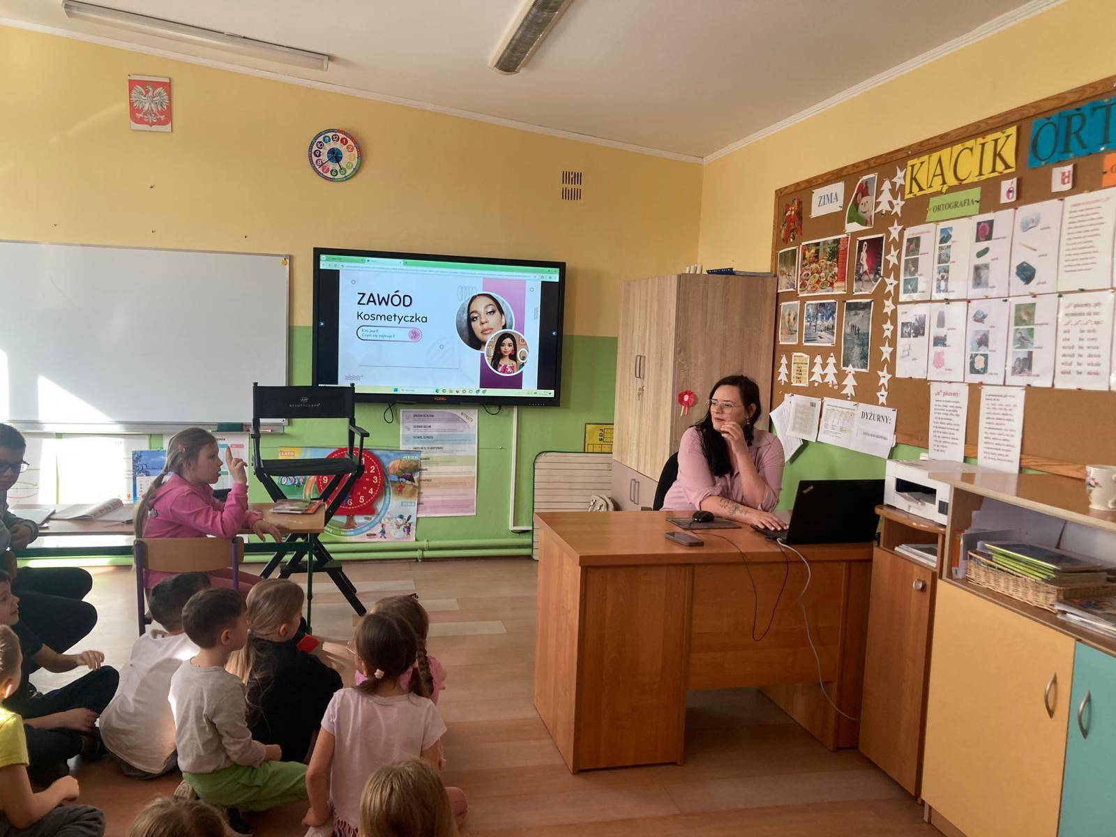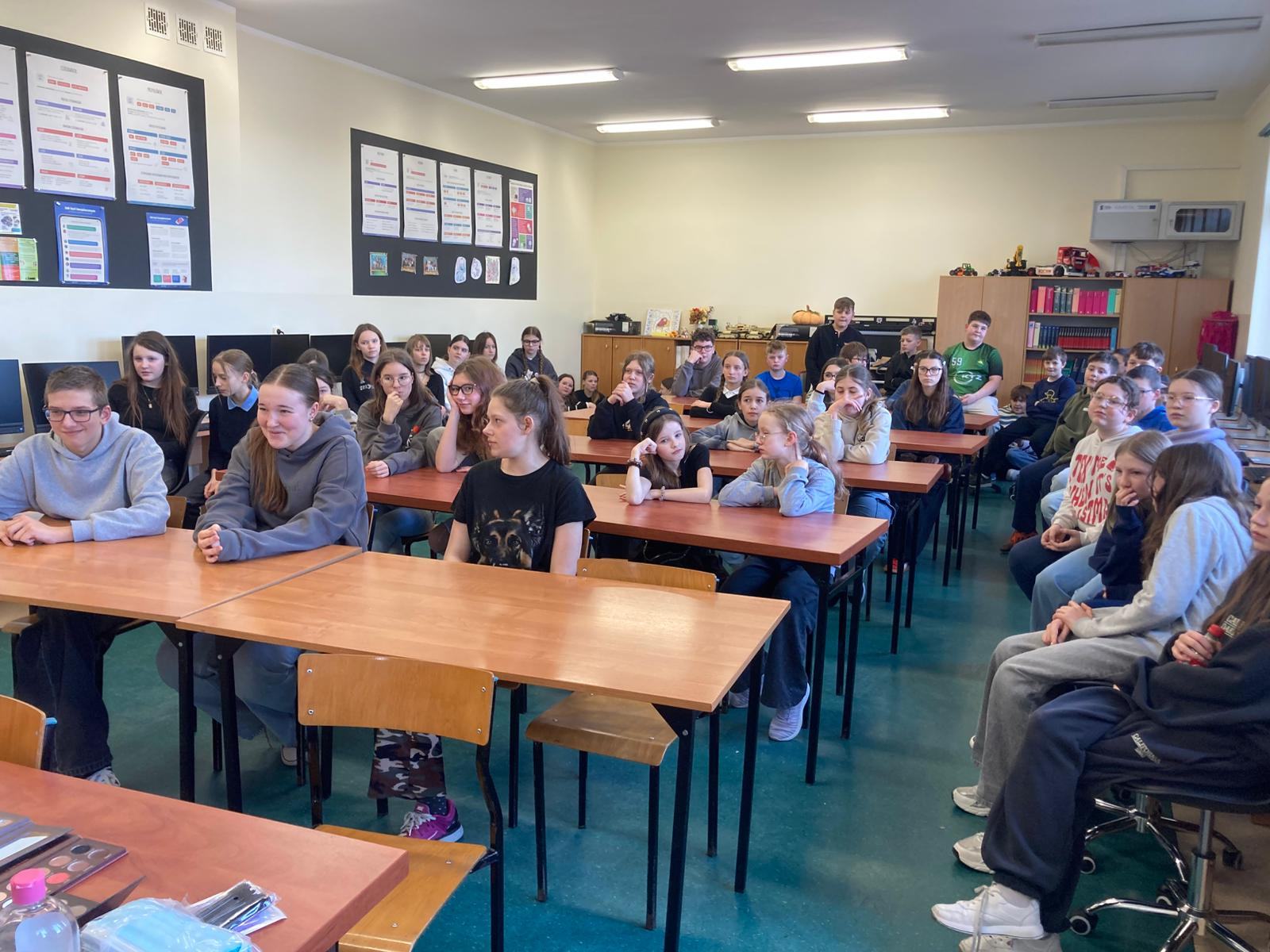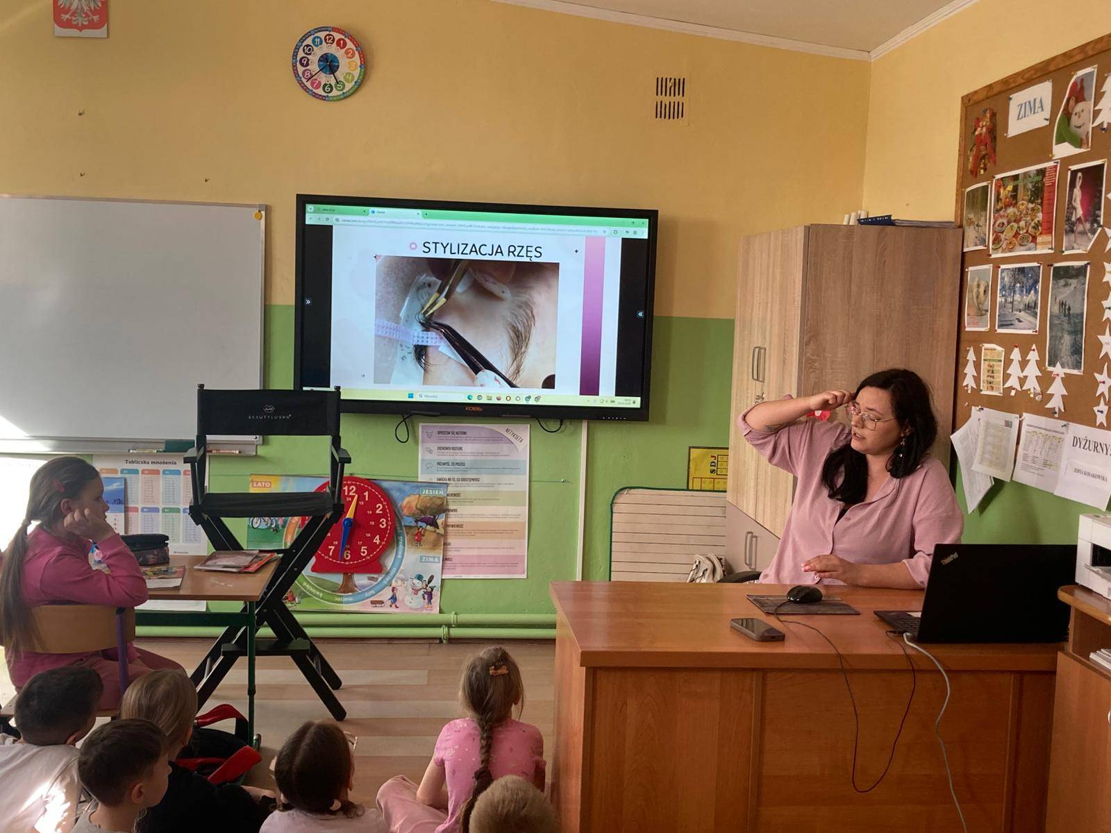 W ramach cyklu „Poznajemy pracę swoich rodziców” naszą szkołę odwiedziła Pani Paulina Śliwińska, mama Filipa. Pani Paulina jest kosmetyczką oraz właścicielką salonu kosmetycznego Paulina Śliwińska Makijażownia & Beauty Studio. Podczas spotkania opowiedziała uczniom o swoim zawodzie, a także o tym, jak wygląda codzienna praca w salonie kosmetycznym. Pani Paulina z dużą pasją mówiła o kosmetologii, która jest nie tylko jej pracą, ale również wielkim zainteresowaniem. Uczniowie mogli dowiedzieć się, jak wygląda droga do tego zawodu, jakie umiejętności są potrzebne oraz jak ważna jest dokładność, cierpliwość i dbałość o szczegóły. Gość przygotowała również prelekcje dla starszych klas, podczas których opowiedziała o makijażu, higienie i czystości. Uczniowie dowiedzieli się, jak ważna jest higiena osobista, w jaki sposób o nią dbać na co dzień oraz jakie nawyki pomagają zachować zdrową i zadbaną skórę. Duże zainteresowanie wzbudziła część praktyczna spotkania. Pani Paulina pokazała, jak wykonać estetyczny i nienaganny makijaż, a chętne uczennice mogły spróbować swoich sił w jego wykonaniu. Dziewczęta z dużym zaangażowaniem uczestniczyły w zajęciach i chętnie wykonywały sobie makijaż pod okiem specjalistki. Spotkanie było bardzo ciekawe i inspirujące. Dzięki wizycie Pani Pauliny uczniowie mogli lepiej poznać zawód kosmetyczki oraz przekonać się, jak ważna jest higiena i dbanie o siebie na co dzień. Serdecznie dziękujemy Pani Paulinie Śliwińskiej za poświęcony czas i podzielenie się swoją wiedzą oraz doświadczeniem.