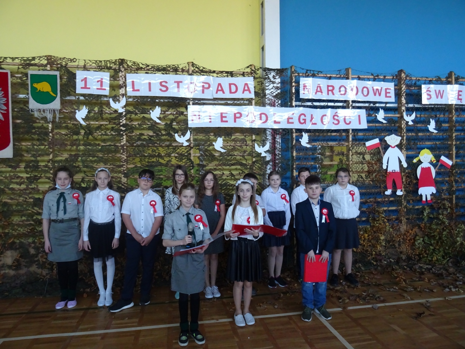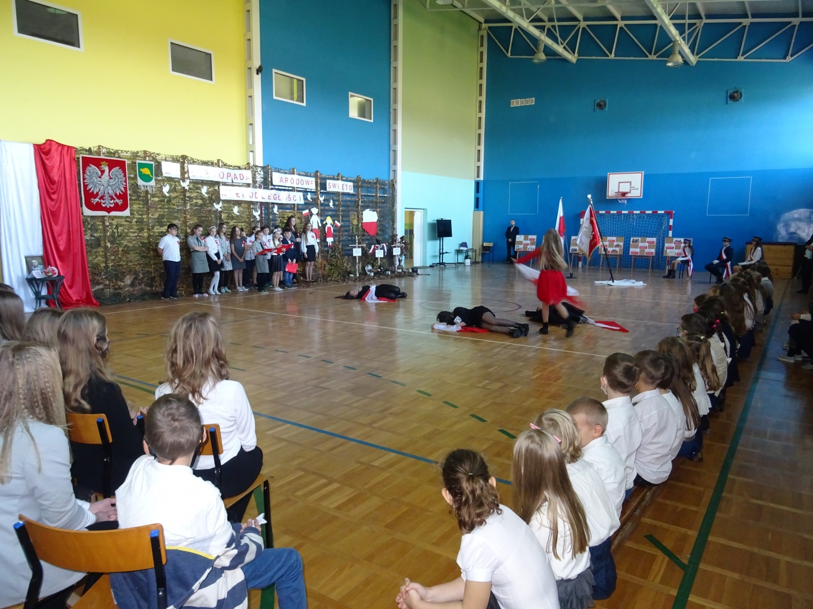 Na początku apelu cała społeczność szkolna wysłuchała deklamacji wierszy w wykonaniu Zosi, Julki, Magdy i Martyny, zwyciężczyń Gminnego Konkursu Poezji Patriotycznej w Bobrowie. Uczennice: Zofia Wydźgowska ( I miejsce – kat. IV-VI)i Julia Witkowska ( wyróżnienie– kat. IV-VI ) przygotowywały się do recytacji pod opieką p. Katarzyny Nadolskiej. Magdalena Klonowska ( II miejsce – kat. VII-VIII) i Martyna Panter ( wyróżnienie– kat. VII-VIII) ćwiczyły recytację poezji pod opieką p. Marka Piotrowskiego. Akademia zakończyła się uroczystym odśpiewaniem ,,Mazurka Dąbrowskiego”, tym samym nasza szkoła wzięła udział w ogólnopolskiej akcji ,,Szkoła do hymnu”. Uroczyste wprowadzenie i wyprowadzenie sztandaru szkoły oraz odśpiewanie hymnu państwowego odbyło się pod kierunkiem p. Arkadiusza Kanieckiego.