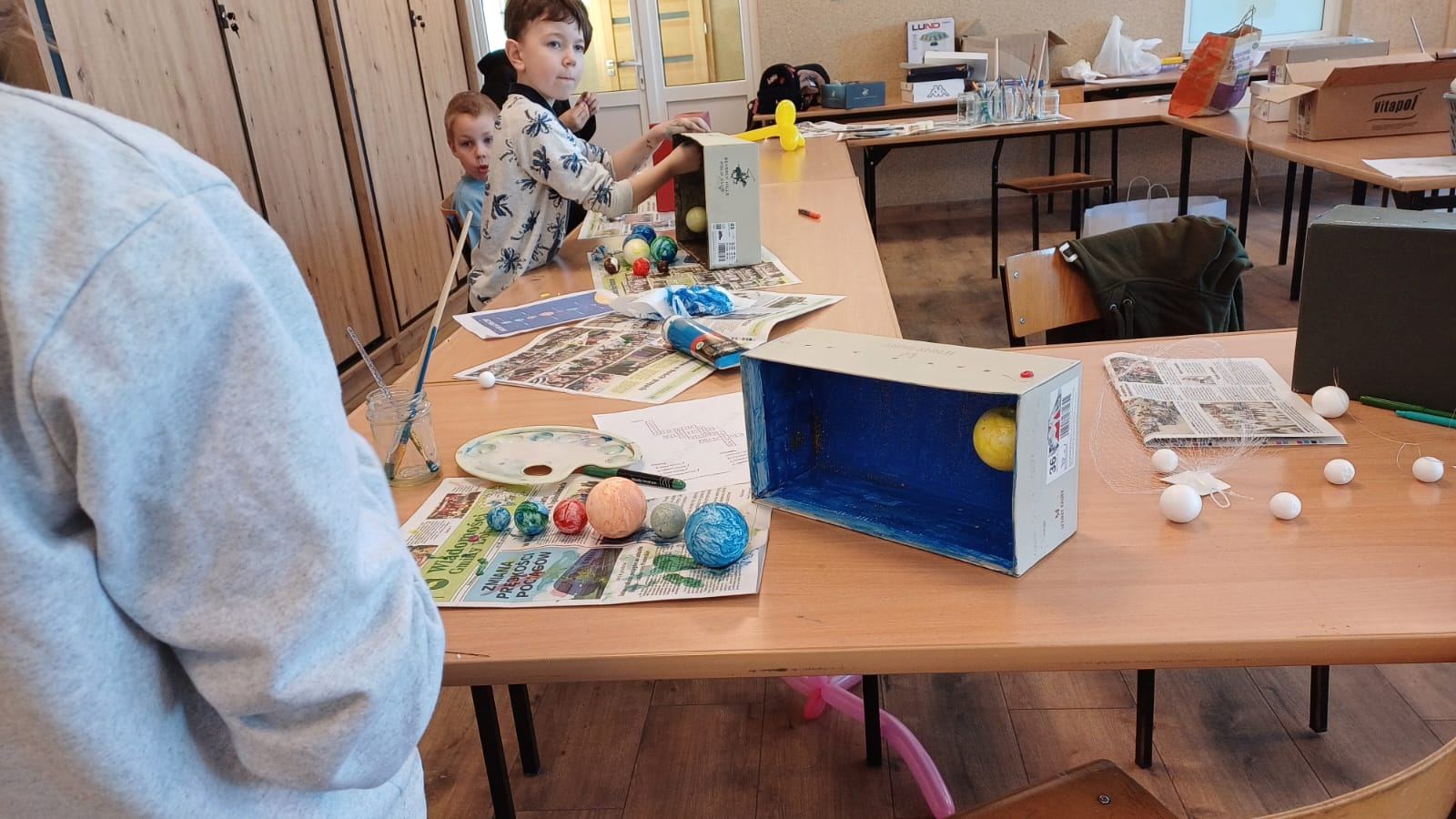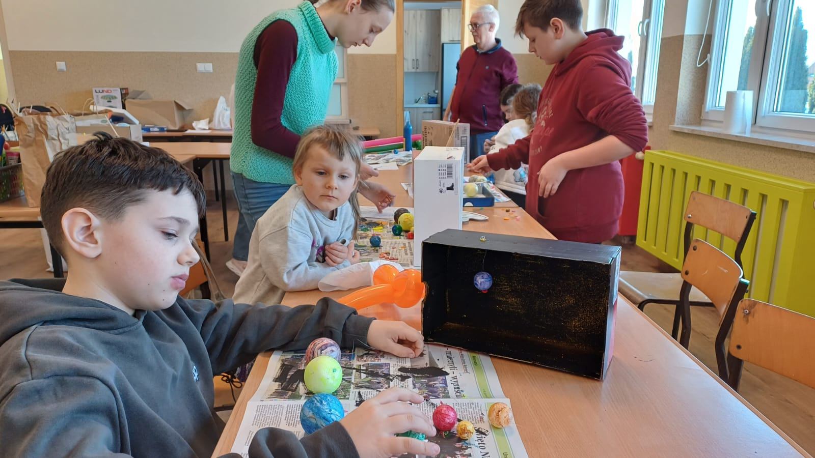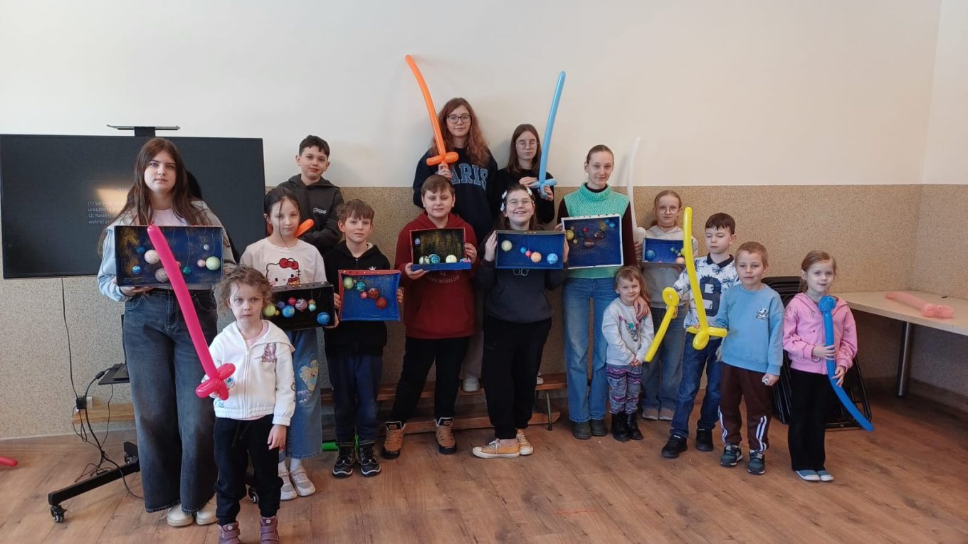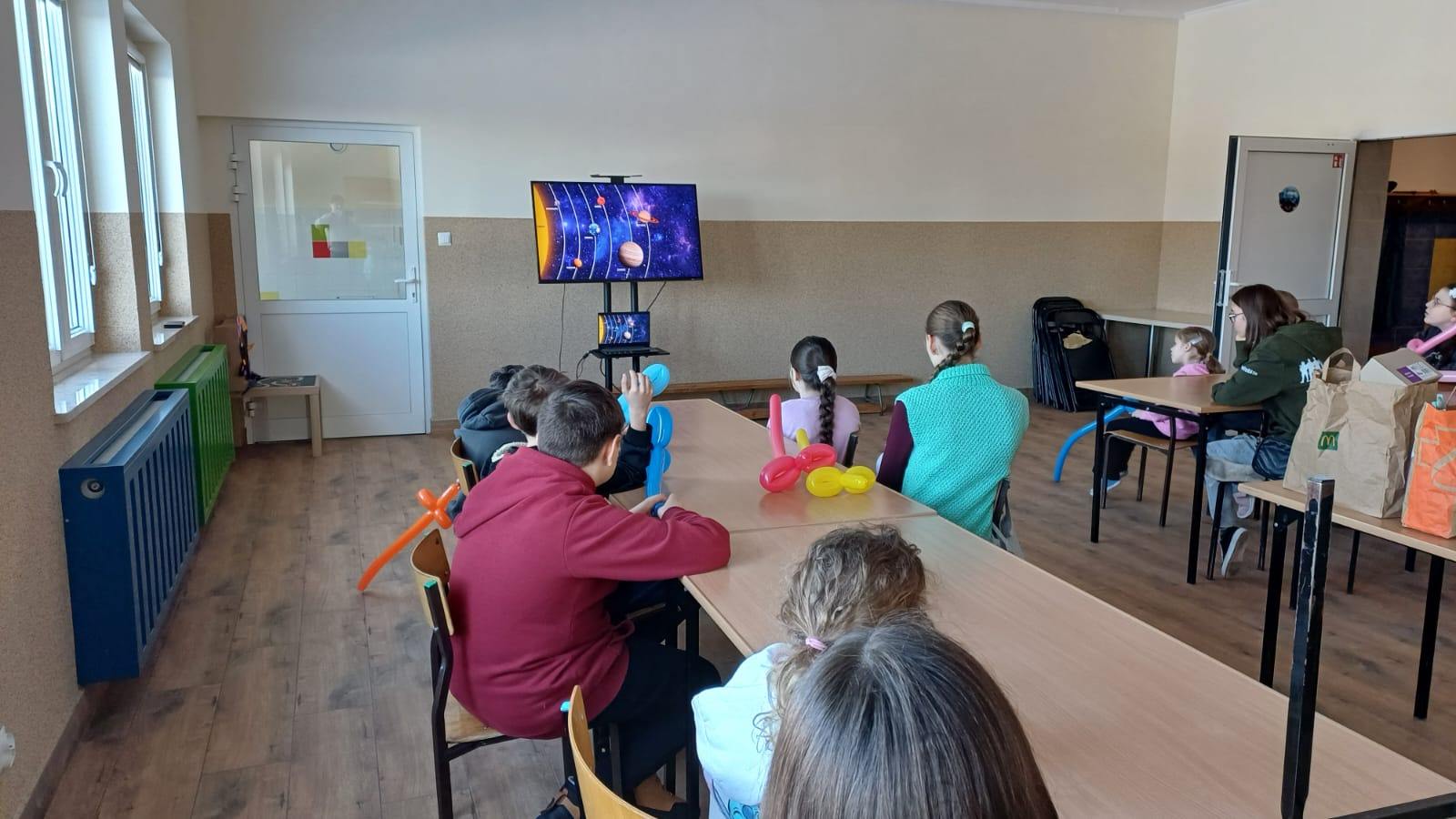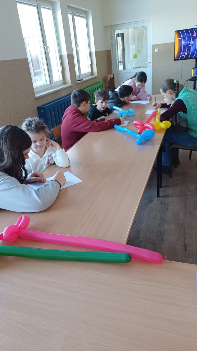 Zajęcia zostały zorganizowane dla dzieci przez Gminną Bibliotekę Publiczną  filia w Małkach wspólnie z opiekunem świetlicy środowiskowej panem Markiem Piotrowskim. Rozpoczęliśmy je od nauki robienia mieczy z podłużnych balonów. To nasza pierwsza przygoda z balonami i z pewnością nie ostatnia. Następnie przeszliśmy na świetlicę, na której został wyświetlony film edukacyjny dotyczący układu słonecznego. Po nim dzieci w parach rozwiązywały krzyżówkę tematyczną. Następnie zrobili zadanie manualne polegające na wykonaniu układu słonecznego w pudełku. Praca pochłonęła dużo czasu, ale efekt końcowy był bardzo zadowalający. Był także czas na naukę robienia popcornu oraz sprawdzenie, czy nadaje się on do konsumpcji.