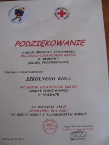 W uznaniu za nasze działania charytatywne 10- cioro uczniów otrzymało paczki świąteczne, a SK PCK pamiątkowe dyplomy – podziękowania.