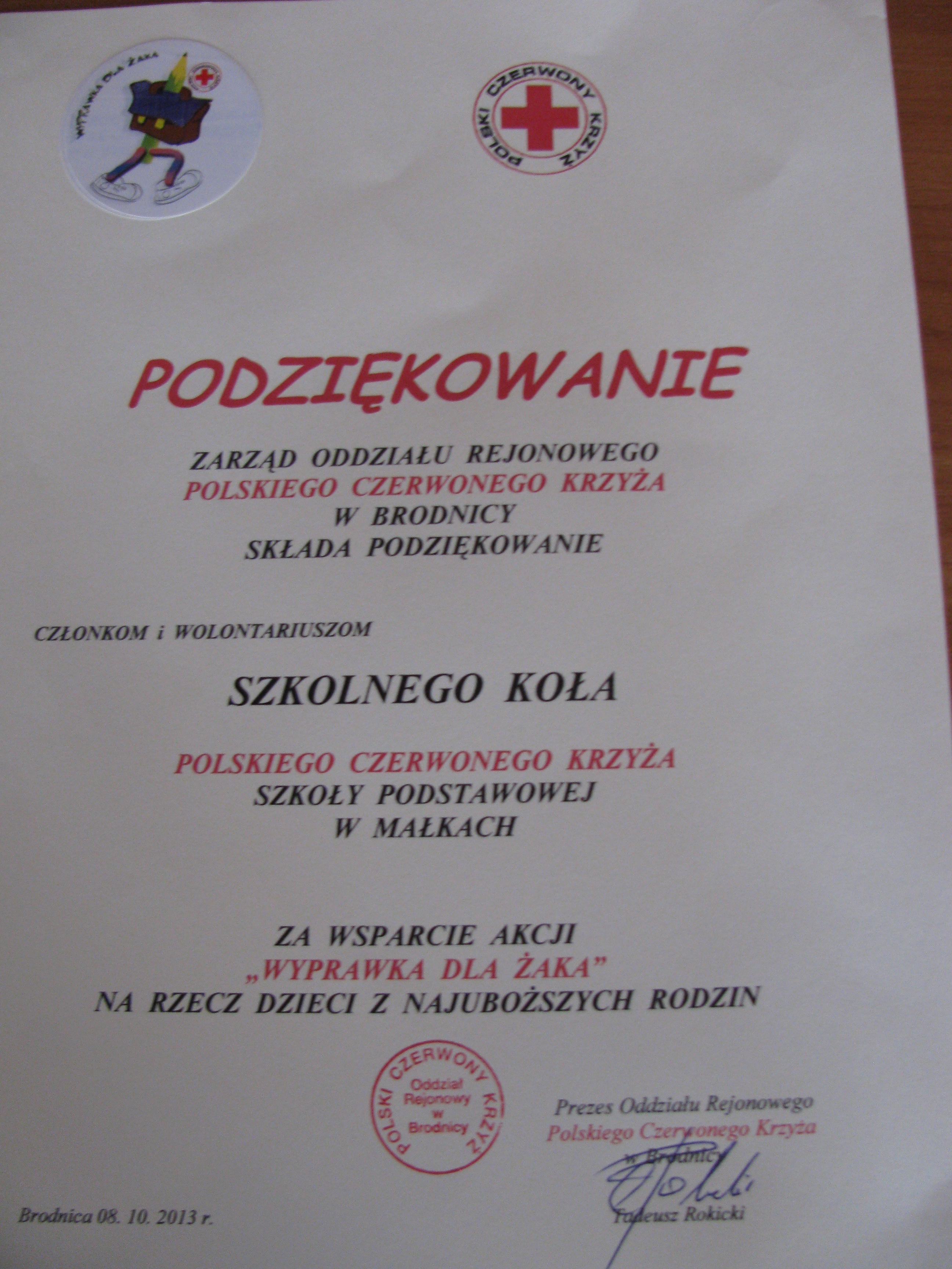 W tym roku szkolnym pierwszą akcją była „Wyprawka dla Żaka”, która zakończyła się 8 X 2013r. Uczniowie pokazali swoje „wielkie serca”. Przynosili długopisy, piórniki, pisaki, zeszyty, bloki i plecak. Zebrane dary zostały przekazane do Zarządu Rejonowego PCK w Brodnicy.